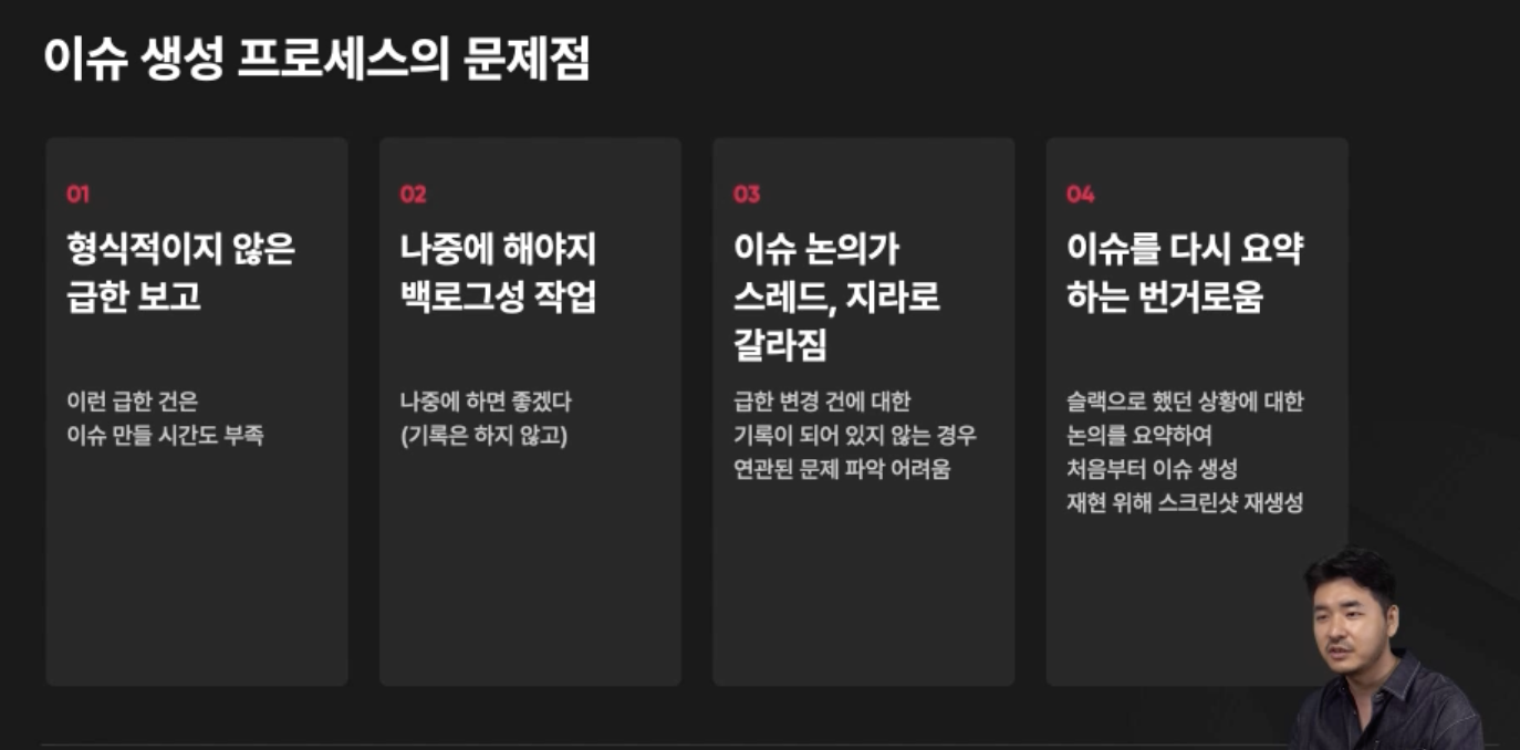 회사에서 업무시 지라같은 칸반보드기반 이슈트랙킹 시스템을 많이 사용합니다. 이때 이슈 내용을 잘못작성하거나 이슈생성 누락하는등의 문제로 업무진행시 어려움을 겪는 상황이 발생하는데요, 본 강의에서는 이슈트랙킹 시스템 사용시 발생할 수 있는 문제점을 지적하고 문제정의부터 어떻게 해결할지 같이 논의하며 진행합니다.
