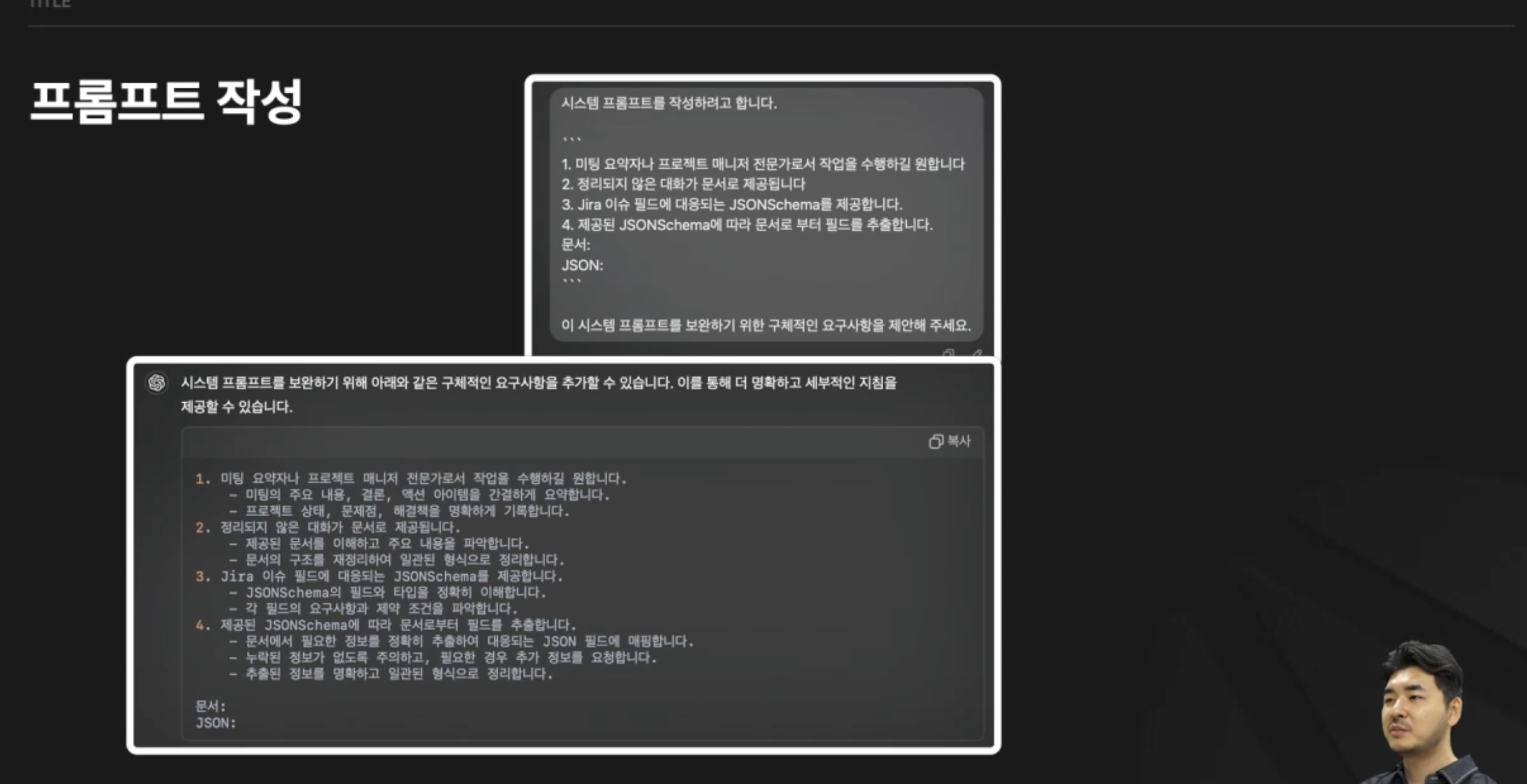해결책으로 슬랙에 입력되는 텍스트를 기반으로 프롬프트 엔지니어링을 통해 지라 이슈까지 생성하는 전 과정을 학습합니다. 이때 개발의 기본 개념인 OOP, JSON 등의 요소도 학습합니다.